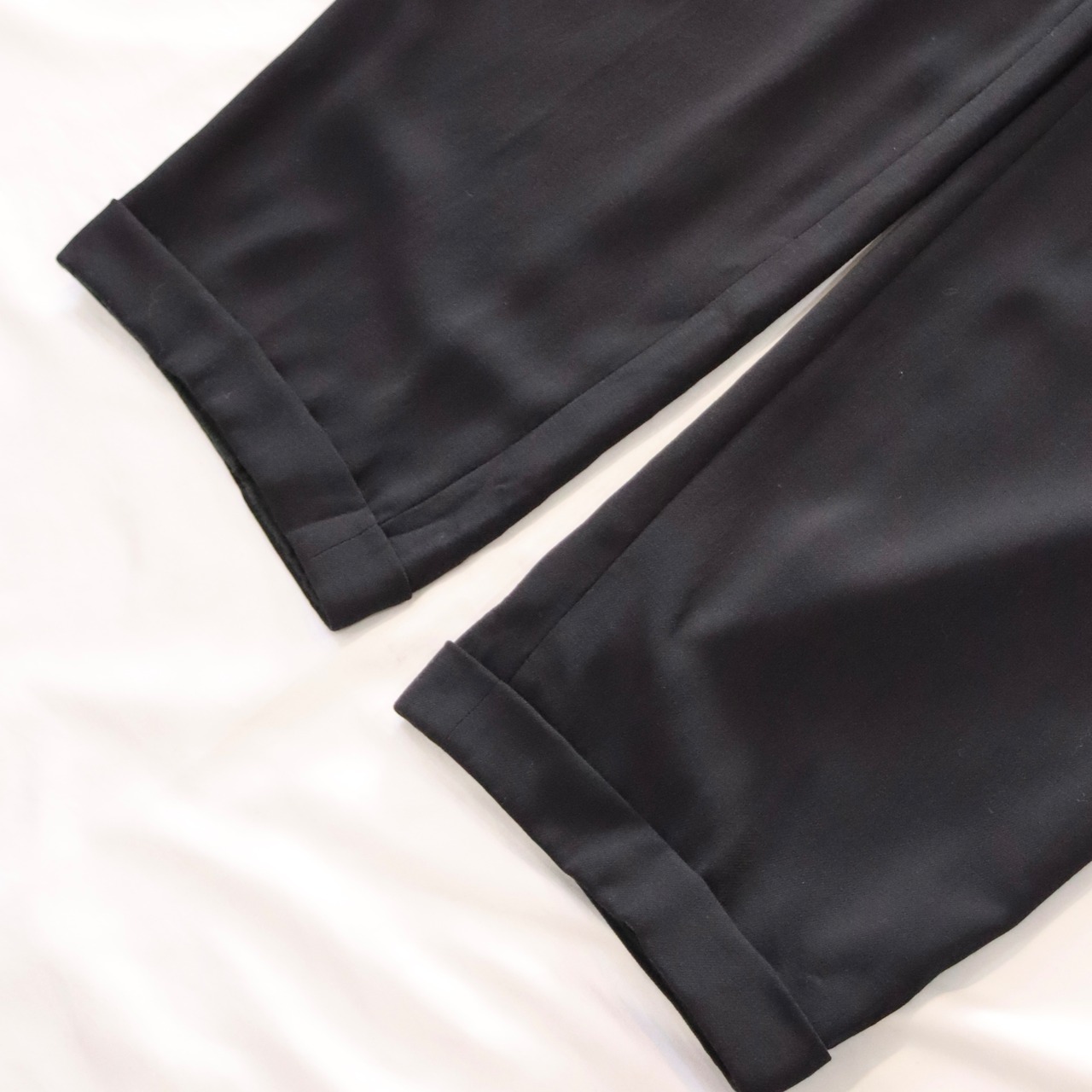 ダークネイビーのドレープ感ある柔らかい生地で通年履ける素材感です。
